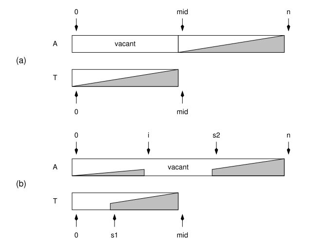 static void merge(data_t A[], int mid, int n, data_t T[]) { /* merge array sections A[0..mid-1] and A[mid..n-1] */ int i, s1, s2; /* copy first section into temporary array T */ for (i=0; i<mid; i++) { copy_data(T+i, A+i); } i = 0; s1 = 0; s2 = mid; /* merge second section at A[mid] with T, putting output back into section starting at A[0] */ while (s1<mid && s2<n) { if (cmp(T+s1,A+s2) < 0) { /* element from T goes next */ copy_data(A+i, T+s1); s1 += 1; } else { /* element from A goes next */ copy_data(A+i, A+s2); s2 += 1; } i += 1; } while (s1<mid) { /* copy over any remaining elements in T */ copy_data(A+i, T+s1); s1 += 1; i += 1; } /* all elements are now in their final positions */ }