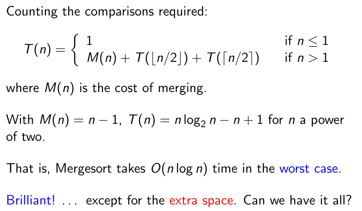 void merge_sort(data_t A[], int n) { data_t *T; T = malloc((n/2)*sizeof(*T)); assert(T != NULL); recursive_merge_sort(A, n, T); free(T); } - recursive call: to sort each part